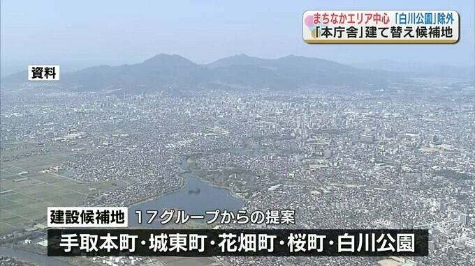 熊本市によりますと、11月末までに17のグループから現在の場所の周辺となる手取本町(てとりほんちょう)のほか、城東町(じょうとうまち)、花畑町(はなばたちょう)、桜町(さくらまち)、そして白川公園(しらかわこうえん)で建設する案が示されたということです。
