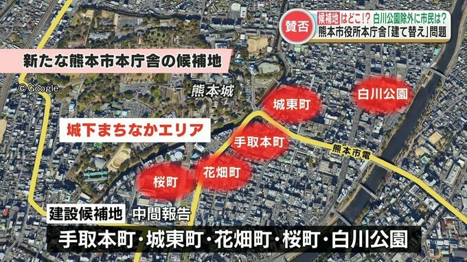 熊本市の中間報告によりますと、11月末までに手取本町(てとりほんちょう)のほか、城東町(じょうとうまち)、花畑町(はなばたちょう)、桜町(さくらまち)、そして白川公園(しらかわこうえん)で建設する案が示されたということです。