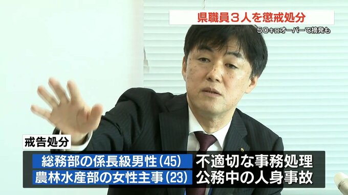 他にも不適切な事務処理で遅延金の支払いを生じさせた総務部の係長級の45歳の男性と、公務中に人身事故を起こした農林水産部の23歳の女性主事をいずれも戒告処分としました。
