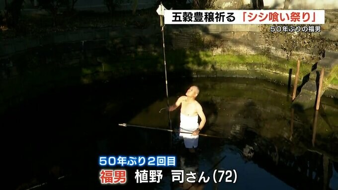 例年、地域の若手が福男に選ばれますが、高齢化が進んでいるため今年は72歳の植野司(うえの つかさ)さんが50年ぶり2回目の福男を務め御幣(ごへい)を付けた竹竿を立てました。