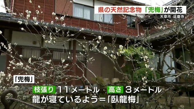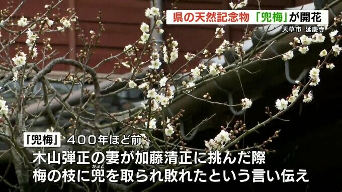 熊本県天草市の寺では樹齢500年以上と言われている県の天然記念物(昭和57年に指定)の兜梅(かぶとうめ)が白い可憐な花を咲かせています。