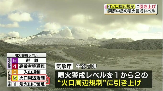 【速報】阿蘇中岳 噴火警戒レベル2「火口周辺規制」に引き上げ 2024年1月23日(火) 15:09 国内 阿蘇中岳の噴火警戒レベルが2の「火口周辺規制」に引き上げられました。気象庁によりますと、阿蘇中岳ではきょう(23日)の観現地調査で火山ガスの放出量が1日あたり2000トンと多くなっていることや火山活動に伴う…