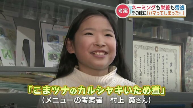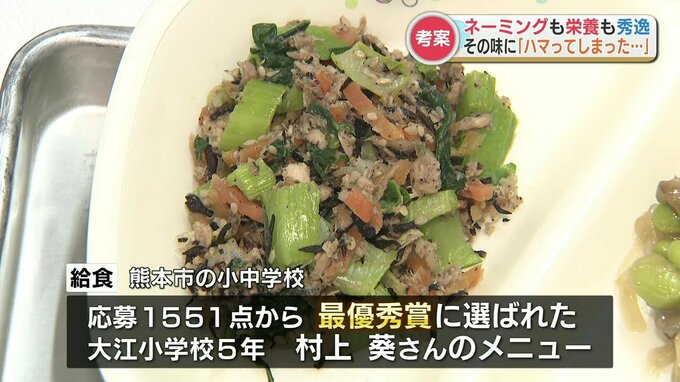 きょう熊本市の小中学校で提供された給食は、応募1551点の中から最優秀賞に選ばれた大江小学校5年、村上葵さんの考案メニュー。