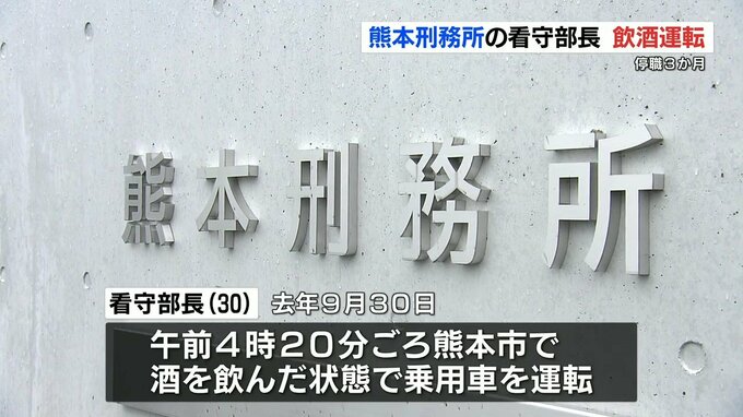 熊本刑務所の看守部長が飲酒運転で懲戒処分「事故を起こさなければ大丈夫だと」 2024年1月27日(土) 18:31 国内 熊本刑務所の男性看守部長が飲酒運転で停職処分を受けました。停職3か月の懲戒処分を受けたのは熊本刑務所の看守部長の男性(30)です。熊本刑務所によりますと看守部長は去年9月30日の午前4時20分ごろ熊本市で、…