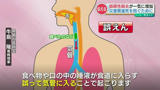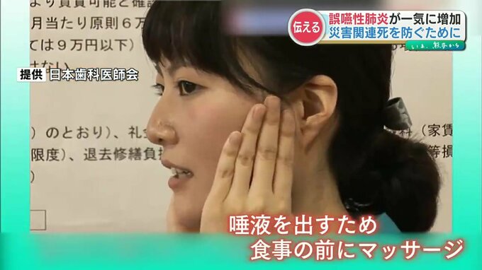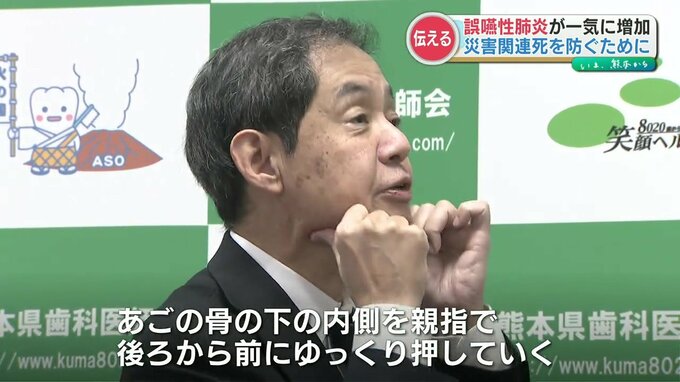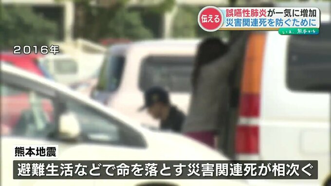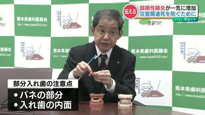 熊本県歯科医師会によりますと、災害時は避難所生活などで歯磨きの回数や水を飲む回数が減ることで、唾液が出にくくなり誤嚥性肺炎が一気に増加するといいます。