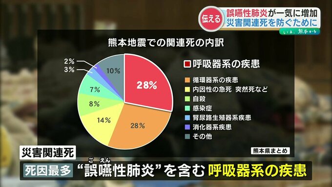 熊本地震では、避難生活などで命を落とす「災害関連死」が相次ぎました。その死亡した原因の中で最も多かったのは、誤嚥性肺炎を含む「呼吸器系の疾患」です。