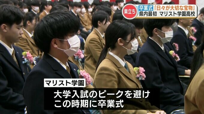 マリスト学園は、1人でも多くの生徒が出席できるよう大学入試のピークを避け、この時期に卒業式を行っています。
