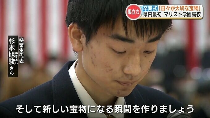 卒業生代表 杉本旭駿さん「みんなと一緒に過ごした日々を大切な宝物として、胸に収め、一歩を踏み出します。また必ず会いましょう。そして新しい宝物になる瞬間を作りましょう」