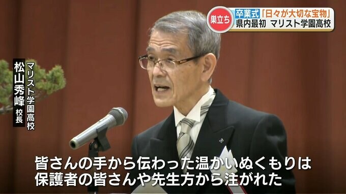 マリスト学園 松山秀峰 校長「皆さんの手から伝わった温かいぬくもりは、保護者の皆さんや先生方から注がれた温かい愛情によって育まれたものだと感じました。その温もりをこれからの人生で出会う多くの人に伝えてください」