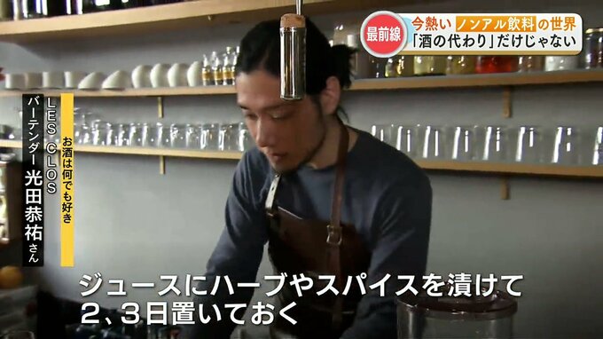 LES CLOS バーテンダー 光田恭祐さん「ジュースにハーブやスパイスをつけて2,3日置いておきます。ドリンクも食事も上質なものをお出しできるように」