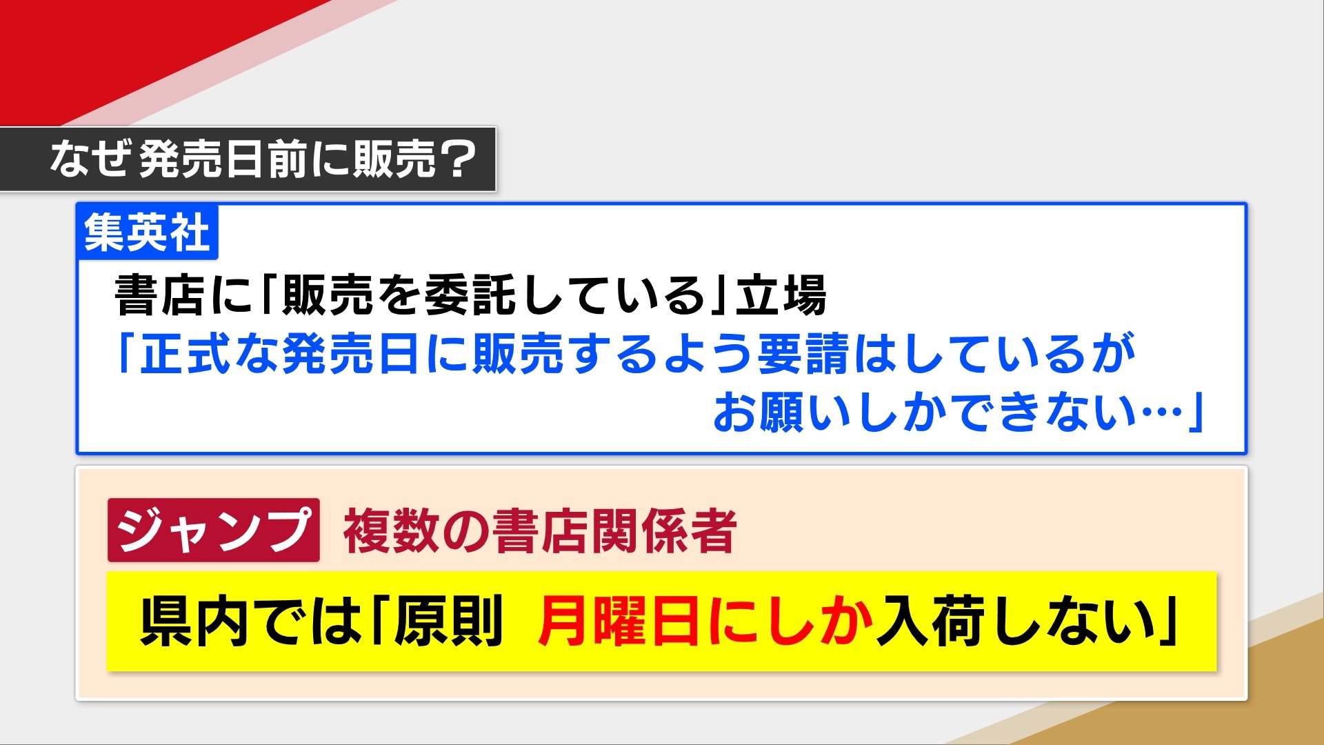 その点について出版社は書店に対して「販売を委託している」立場のため、「正式な発売日に販売するよう要請はしているが、お願いしかできない」としています。