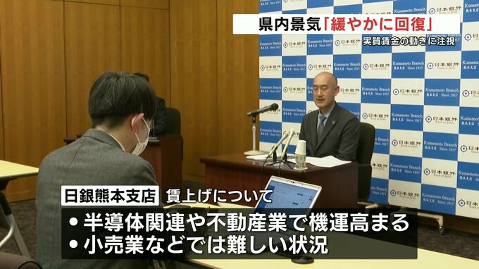 日銀熊本支店は賃上げについて、半導体関連や不動産業で機運が高まっているものの小売業などでは難しい状況があり、全体としての広がりは不確実性が高いとしました。