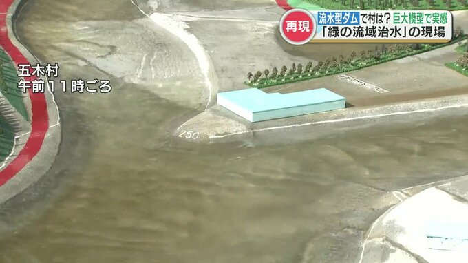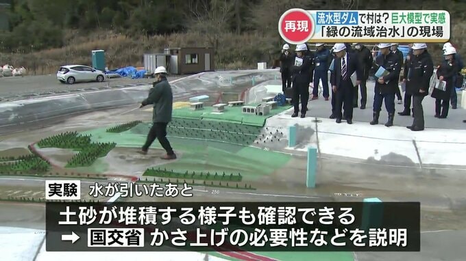 また実験では、水が引いたあと土砂が堆積する様子も確認でき、国土交通省の担当者が土地のかさ上げの必要性などを説明しました。