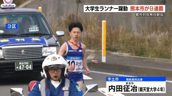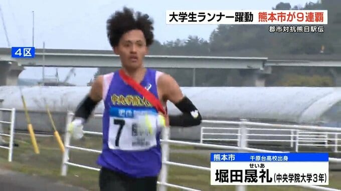 4区を4位でスタートした熊本市は、中央学院大学の堀田晟礼(ほった せいあ)が1分51秒差を逆転し、先頭の座を奪う区間新記録の走りをみせました。