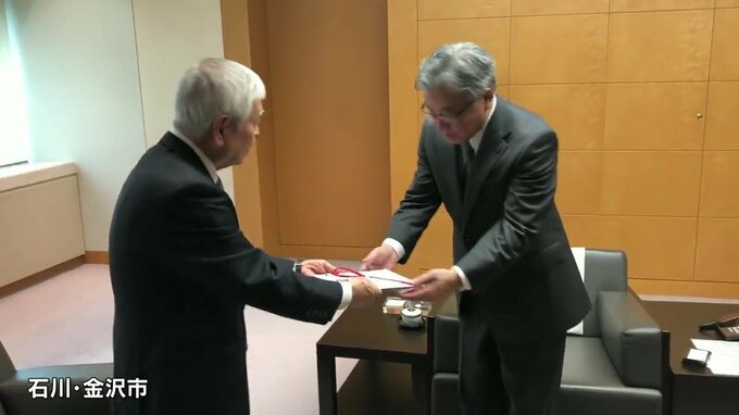 14日午後、石川県金沢市を熊本日日新聞社の河村社長と熊本放送の坂口社長が訪れ、寄せられた救援金、利息を含め総額1億885万2511円の目録と、寄付者の名簿を北國(ほっこく)新聞社の砂塚(すなづか)社長に手渡しました。