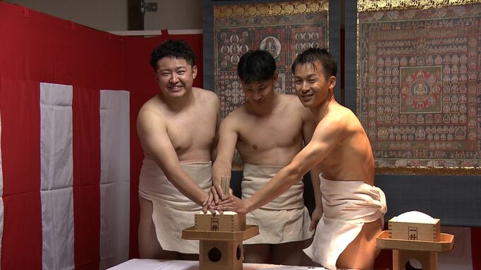 宝木争奪戦に強い思いを持って臨む寺坂グループです。宝木投下の2時間前、緊張した面持ちでまわしを締めていました。