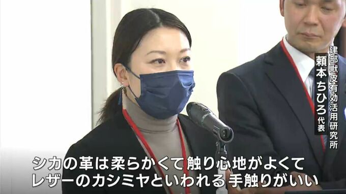 (建部獣皮有効活用研究所 頼本ちひろ代表)「シカの革は、柔らかくて触り心地が良くてレザーのカシミアといわれるほどに手触りがいいんですよ。イノシシの革は、ワイルドなイメージで、見た目が自分的には格好いいと思う。男性の方からも格好いいと言われる」