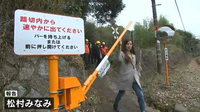 (松村みなみ記者)「歩行者は左右の安全確認を行いこのようにバーを持ち上げて線路の中に入ります。