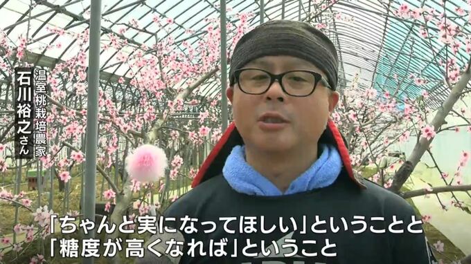 (温室桃栽培農家 石川裕之さん)「ちゃんとした実になってほしいということと糖度が高くなればということ。それを願って花粉を付けています」