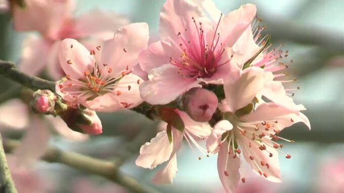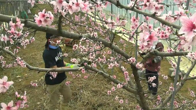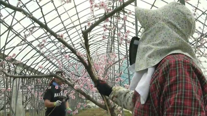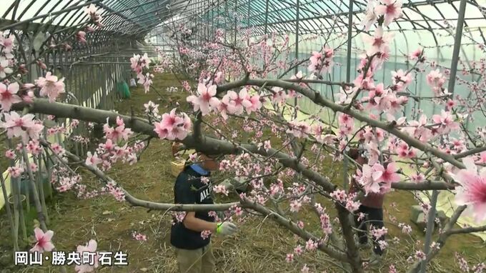一足早い春の到来です。岡山県勝央町の農園で温室桃の花が満開となり、授粉作業が行われています。