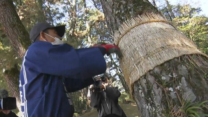 寒い時期に枝先から下りてくる害虫を菰の中に誘い込み、暖かくなる前に菰ごと焼き払う、昔ながらの害虫駆除の方法で毎年この時期に行われています。