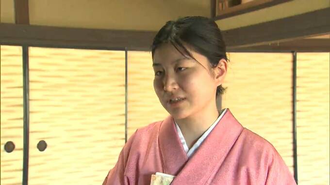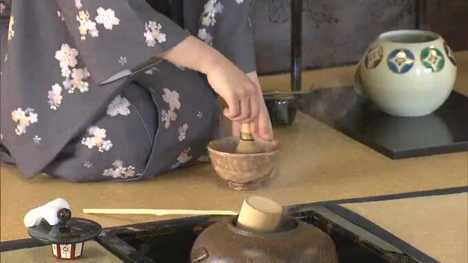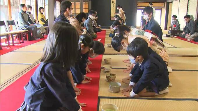 後楽園の鶴鳴館では、地元メーカーのひな人形が飾られ、茶会が開かれました。この茶会は、岡山市内の大学生や園児などでつくる「翔(しょう)茶の湯の会」が開いたもので、参加者は和やかに味わっていました。
