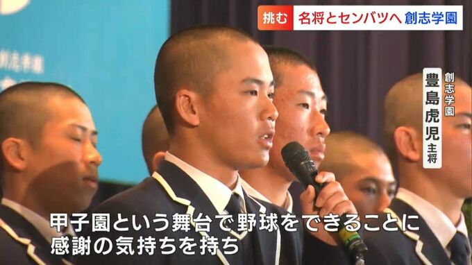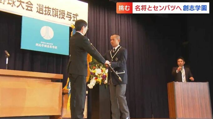 3月4日に行われた壮行式では、甲子園の入場行進で掲げるセンバツ旗を受け取り、集まった全校生徒や教職員らにセンバツでの活躍を誓いました。