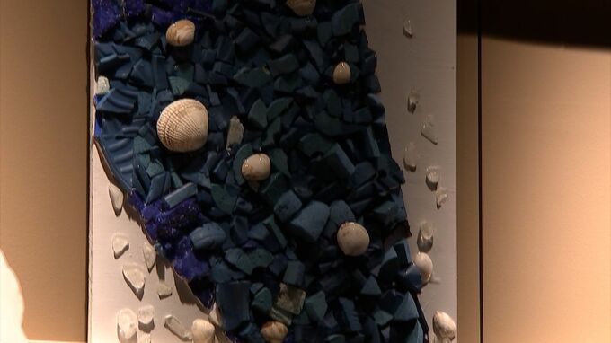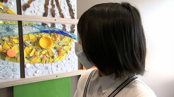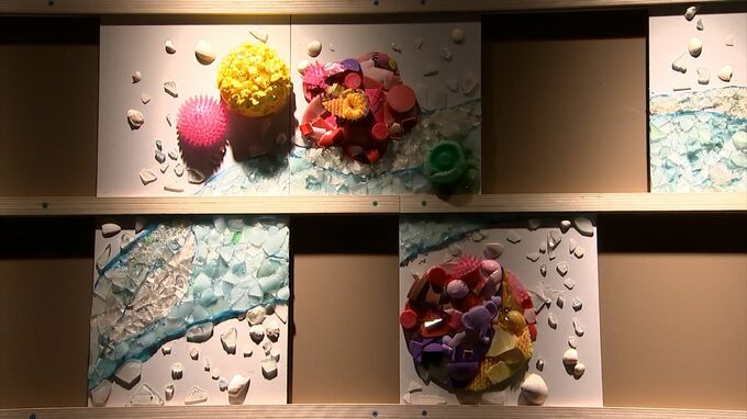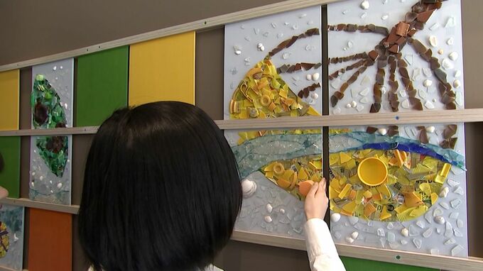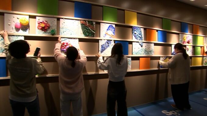 香川短期大学の学生による作品展示の様子が公開され、学生たちは3~4段に仕切られた20平方メートルの壁面に、集めた海ごみで作った45枚のパネルを展示しました。