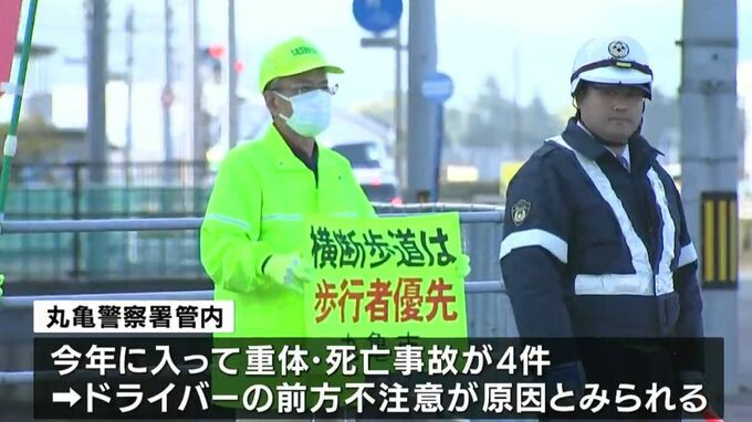 丸亀警察署管内では今年に入って重体、死亡事故があわせて4件起きていて、いずれもドライバーの前方不注意が原因とみられています。