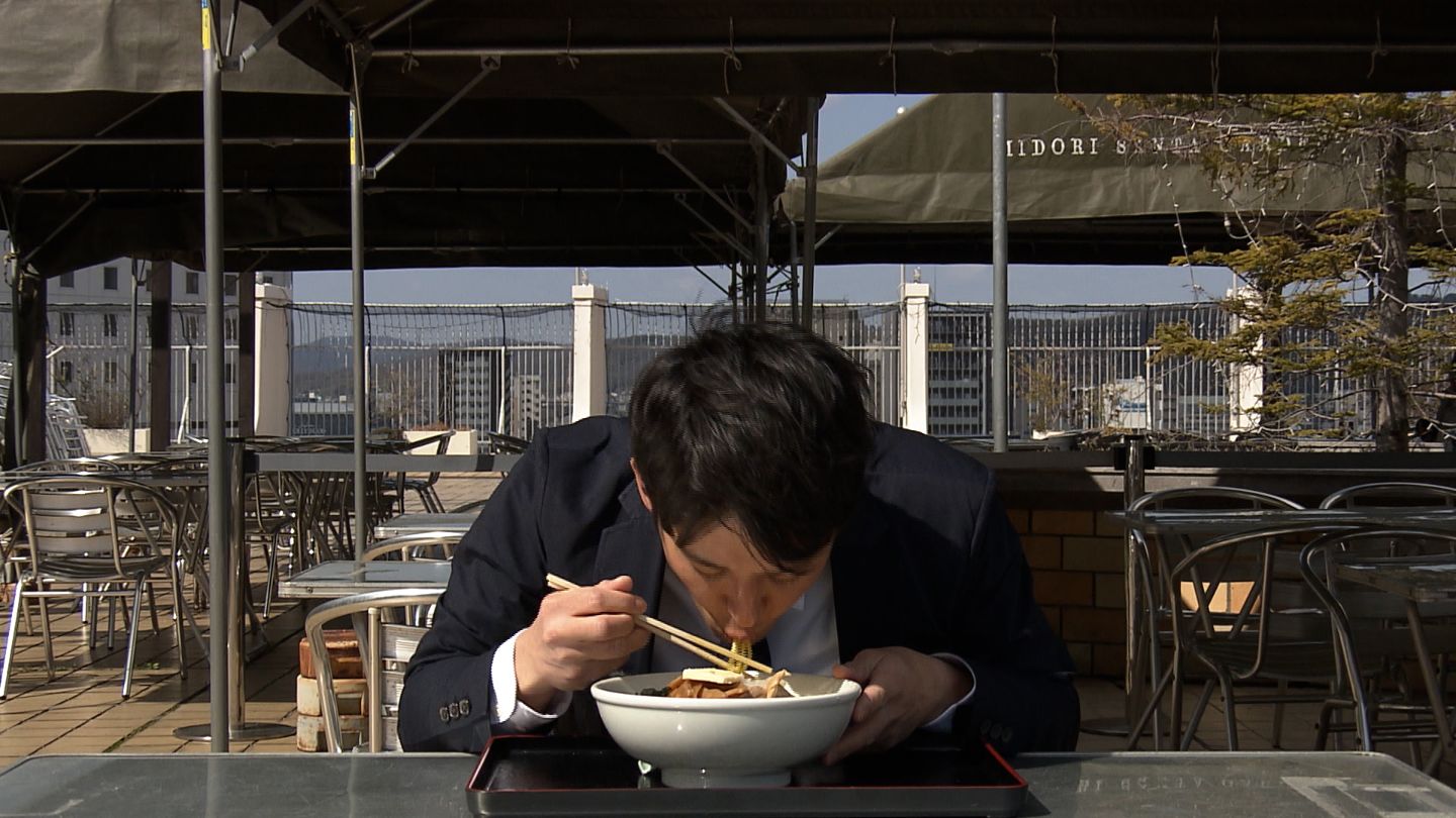 「こちら青森県民のソールフード、みそカレー牛乳ラーメンです。ではさっそくいただきます。カレーのスパイスが牛乳とみそが入ることでまろやかでさっぱり食べられます。」