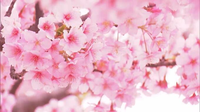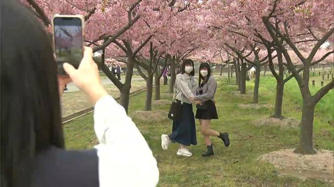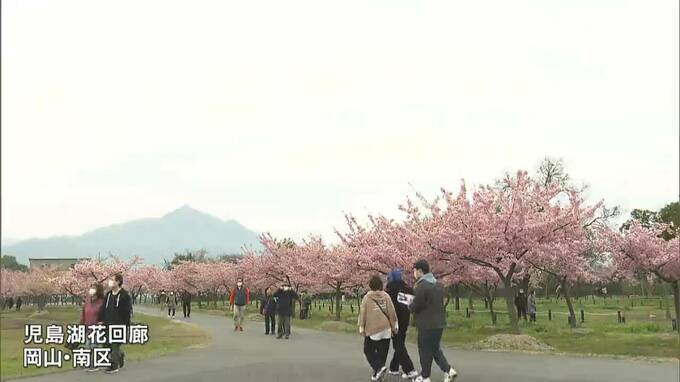 華やかな濃いピンク色。早咲きの河津桜およそ6000本が満開を迎えた児島湖花回廊(こじまこ・はなかいろう)です。