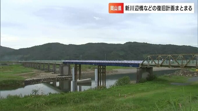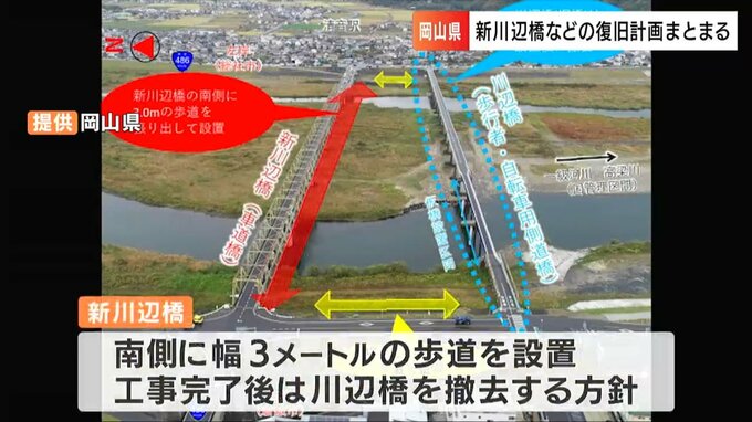 岡山県は河川管理者である国と復旧の方向について協議を行った結果、「新川辺橋」の南側に幅3メートルの歩道を張り出して設置するとともに、堤防を拡幅して歩道を整備し、工事完了後は橋脚の一部が傾いた「川辺橋」を撤去する方針を決めたものです。