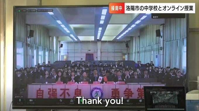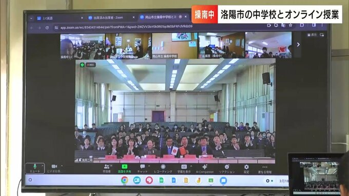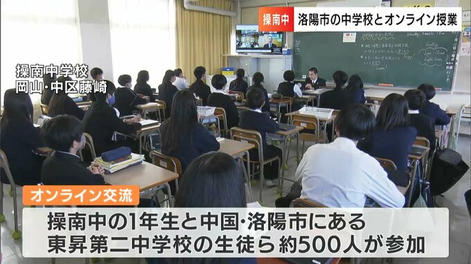 岡山市中区の操南中学校で行われたオンライン交流には、1年生と岡山市が友好提携を結ぶ、中国・洛陽市にある東昇第二中学校の生徒ら合わせて約500人が参加しました。