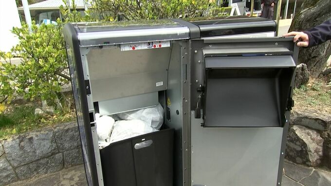 「こちらに設置されたごみ箱、ただのごみ箱ではなくてグッとごみを圧縮することができるんです」