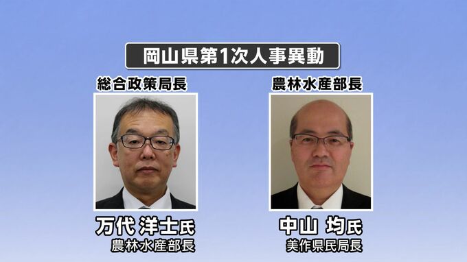主な異動では、総合政策局長に万代洋士・農林水産部長。農林水産部長に中山均・美作県民局長。