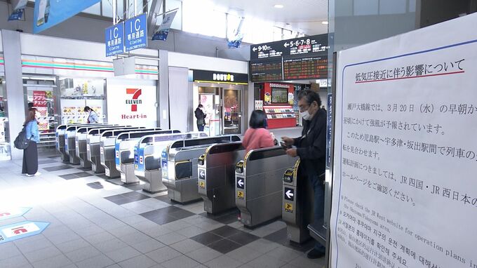 一方、きょうは風の影響も出ました。海沿いを中心に強風が吹き荒れ、JRは、岡山と四国とを結ぶ瀬戸大橋線の快速マリンライナーや特急などの運転を始発から見合わせました。