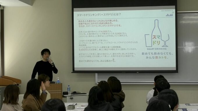 特別セミナーは適正飲酒、いわゆる「スマートドリンキング」について学んでもらおうと、アサヒビールが香川大学と連携して20歳以上の大学生にむけて、実施したものです。