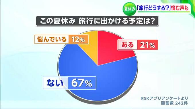RSKでは夏休みの旅行の予定について、アプリでアンケートを行いました。旅行に行く「予定がある」と答えた人が21%に対して、「ない」と答えたのは67%でした。