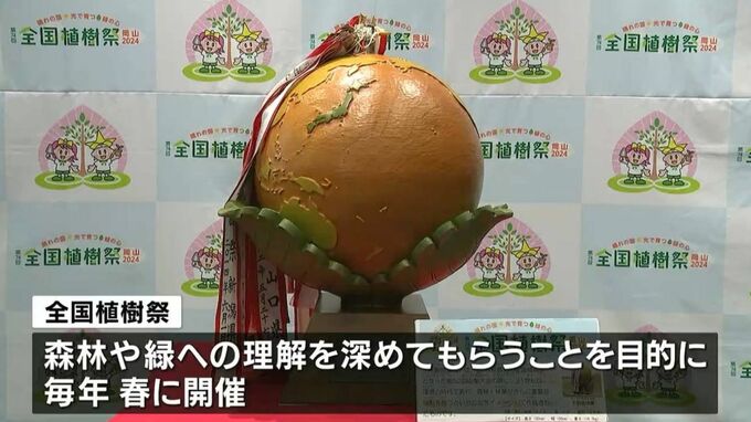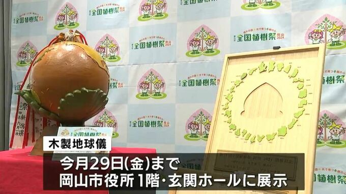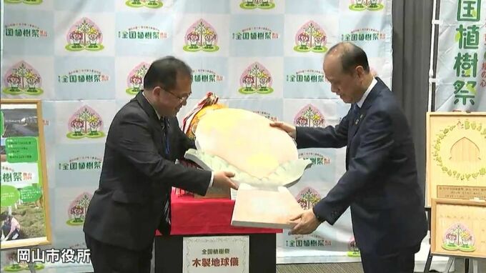 5月に岡山市で開催される全国植樹祭をPRするため、岡山県内を巡回してきた木製地球儀が岡山市に受け渡されました。