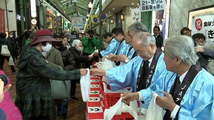 JAグループ岡山の職員らが「きぬむすめ」と「にこまる」の300グラムパックなど500セットを通行人に配り、今後、家庭などでも楽しんでもらえればと呼びかけました。