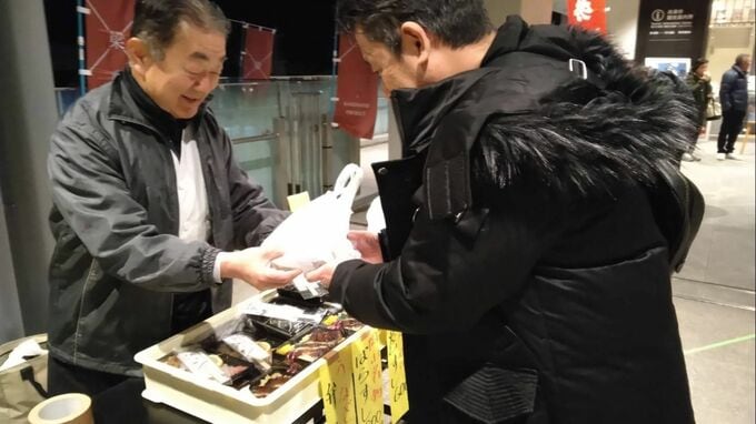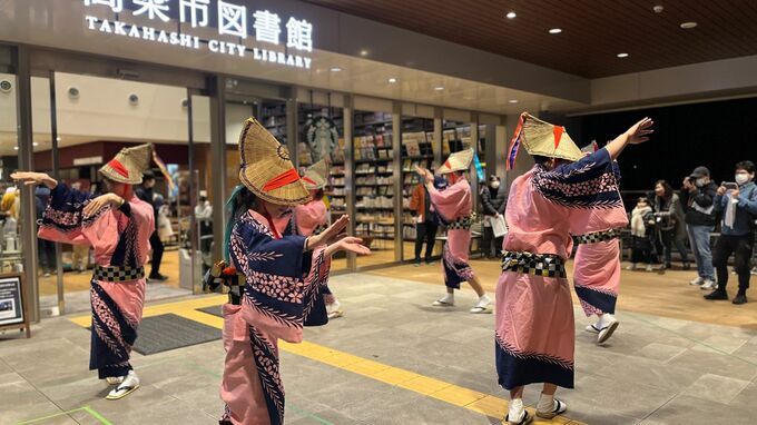 停車時間は、約40分。備中高梁に伝わる盆踊り「松山踊り」(【画像③】)や特産品の販売(【画像④⑤⑥】)で乗客をおもてなしします。