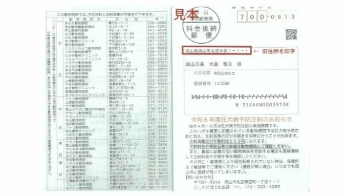 岡山市はきょう(28日)、「令和6年度狂犬病予防注射のお知らせ」の案内はがきに記載ミスがあったと発表しました。