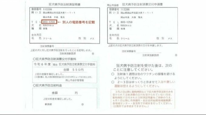 岡山市によりますと、今月21日に保健所衛生課が発送した「狂犬病予防注射の案内はがき」33,689通のうち1,170件の記載に誤りがあり、(【画像①】【画像②】のように)「別人の電話番号が記載されていたもの」が975件、「旧住所が印字されたもの」が195件あったということです。