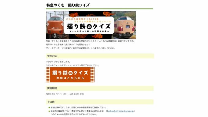 クイズを企画した総社市によりますと、JR伯備線沿線には「撮り鉄」の方が多く訪れて町がにぎわっている一方、「無断駐車」「線路内への侵入」など迷惑・危険行為も散見されるということです。