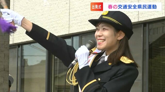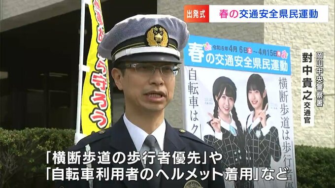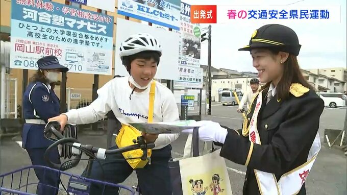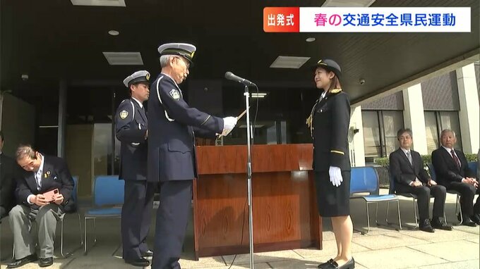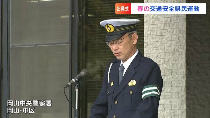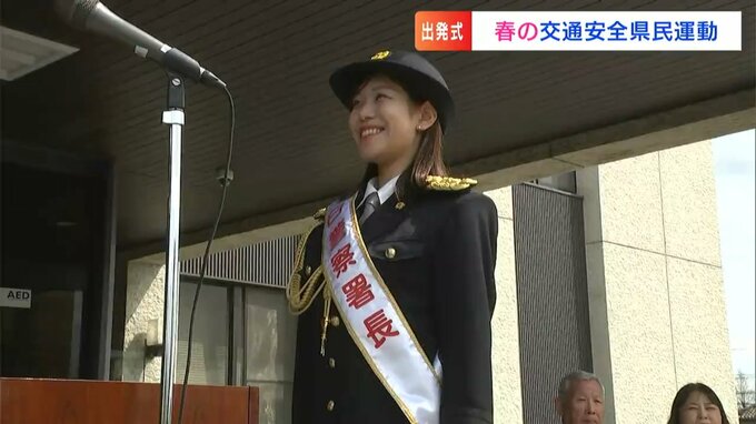 岡山中央警察署で春の交通安全県民運動の出発式が行われました。一日署長を務めたのは、RSKイブニングニュースでキャスターを務める杉澤眞優アナウンサーです。