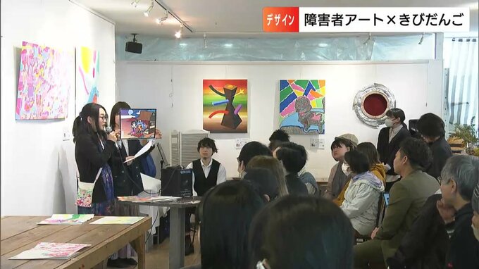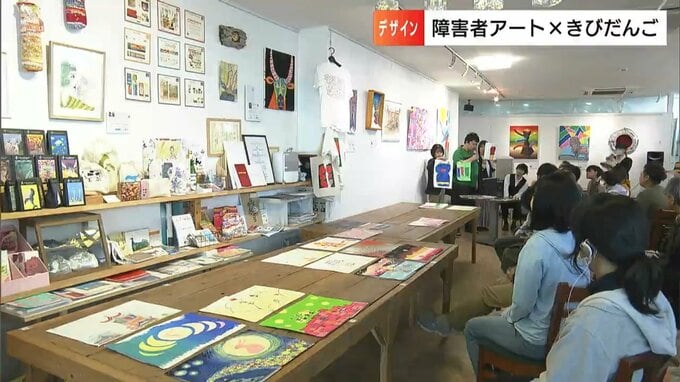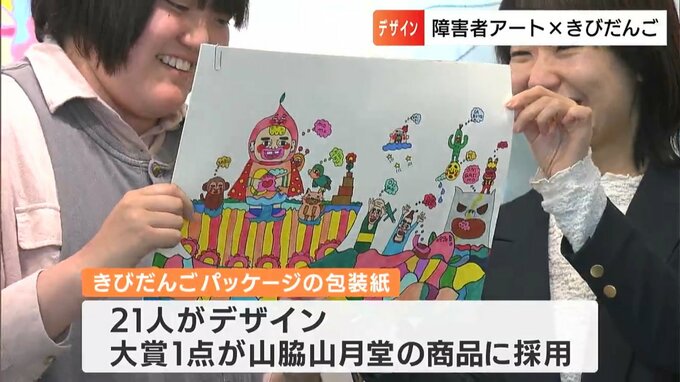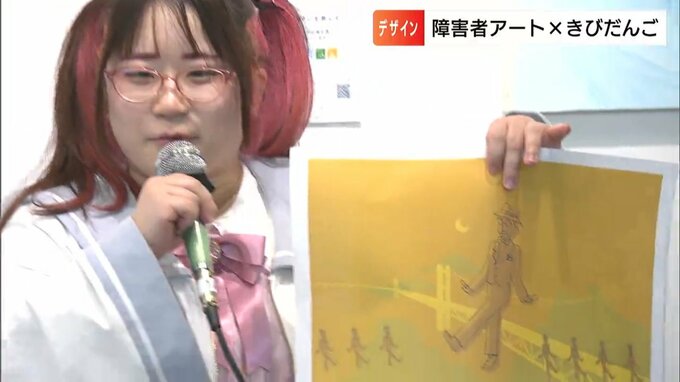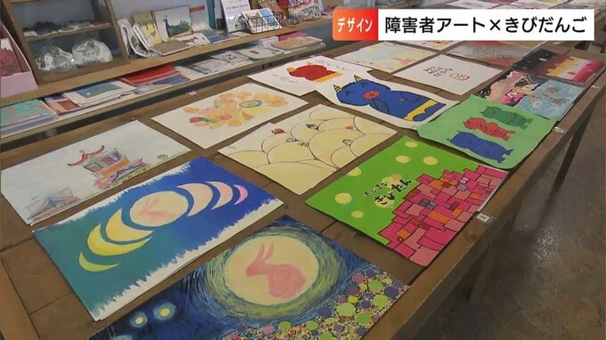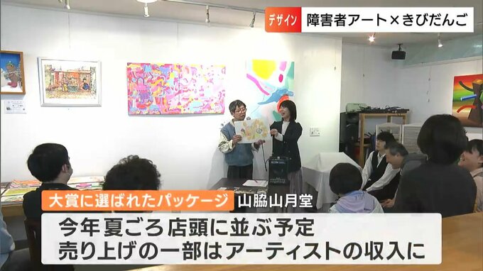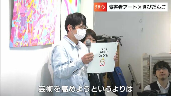 岡山の名産品と障害のあるアーティストのコラボレーションです。就労継続支援の事業所を利用する人たちが、きびだんごのパッケージの包装紙をデザイン、商品化に向けた審査会が開かれました。