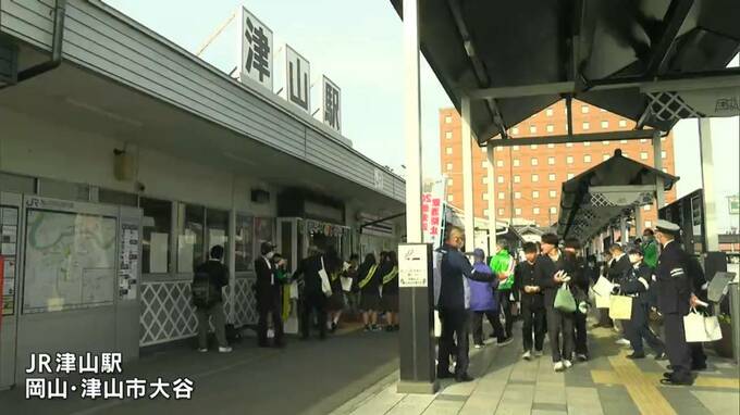 JR津山駅で行われた、飲酒運転撲滅と20歳未満の飲酒防止の重要性を訴える啓発活動です。津山市・真庭市の小売酒販組合などが毎年4月に行っている取り組みで、去年からは地元の高校生も参加しています。