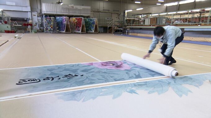 この日、京都の老舗織物メーカーを訪ねると、11枚の布が。すべてを並べ仕上がり具合を細かく確認していました。これを縫い合わせて、祝幕にするのです。