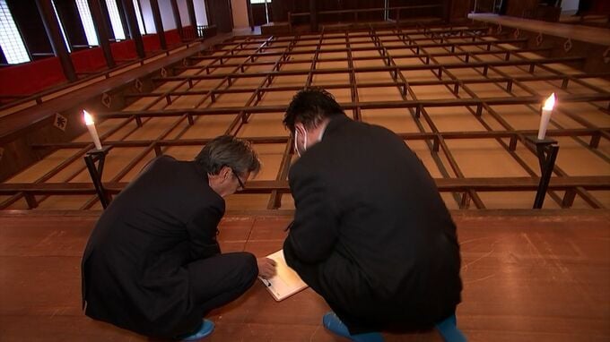 去年(2023年)12月。金丸座復活にむけた準備がすでに始まっていました。巨大な祝幕の寸法をはかる作業です。天井まで上ったり、レーザーポインターを使ったり。とても大がかりなものでした。