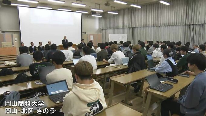 岡山商科大学で岡山県内の経営者を迎え、経営のノウハウなどについて学ぶ「岡山経営者論」の開講式がきのう(15日)開かれました。